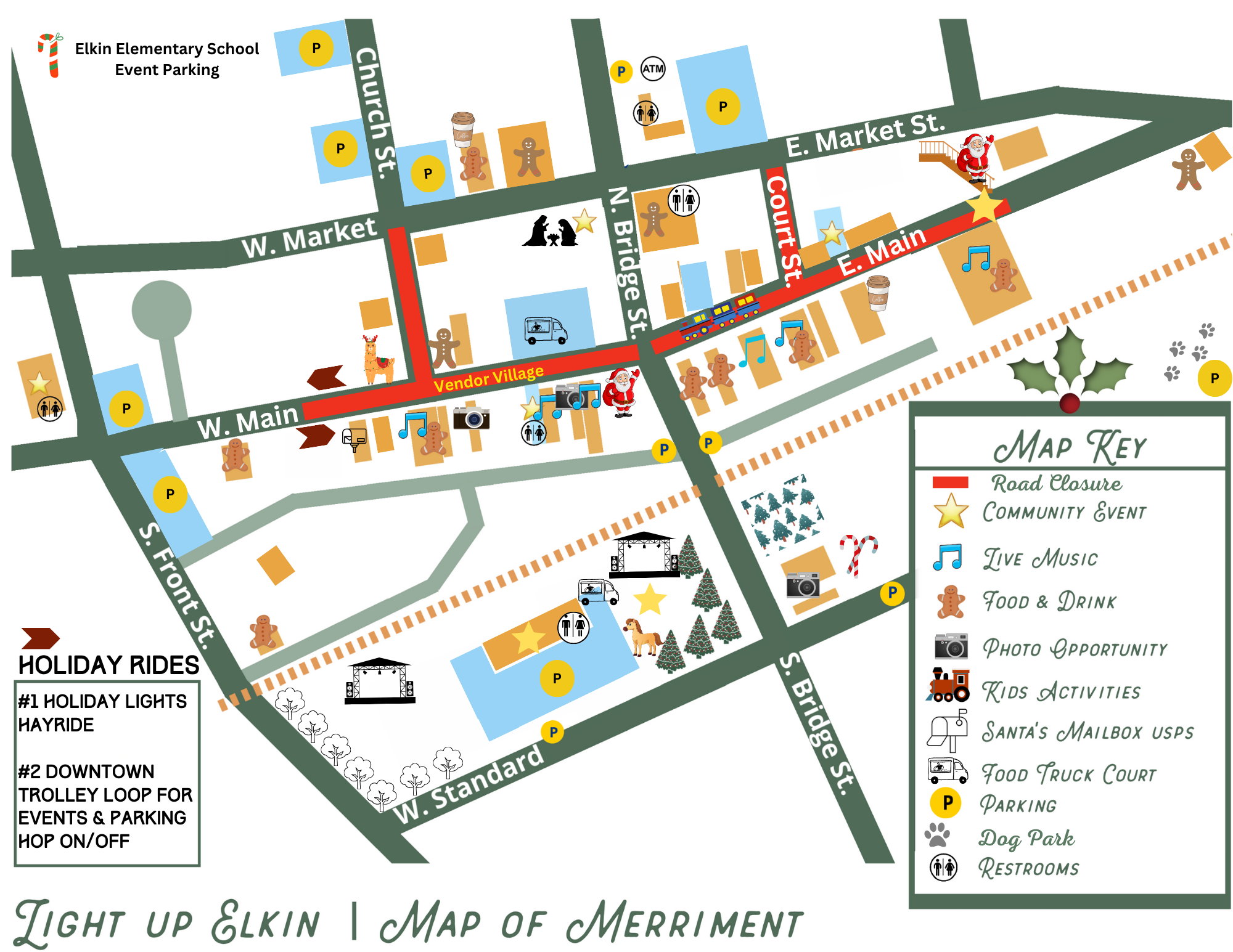 Starting at POST OFFICE, to EES parking lot, Live Nativity, Pony Rides, E Main St access (to Angry Troll/November Room), Black Bear Brunswick Stew Fund Raiser, Elkin Dog Park (parking on E Standard St), Candy Cane Lane Photo Op, Yadkin Valley Heritage Center (Parking on W Standard), Elkin RailYard, then back to Post Office. Sponsored by The Elkin Main Street Advisory Board